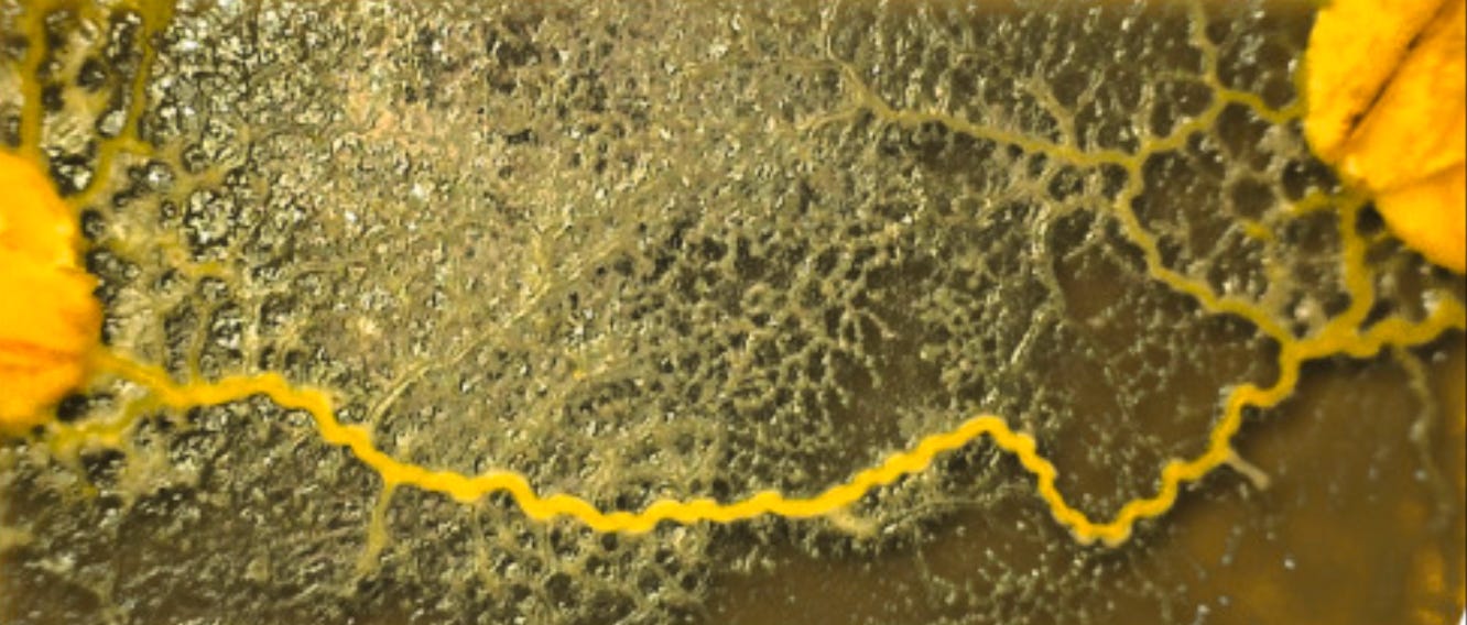 The slime mold Physarum polycephalum in its plasmodium form. Although they are single-celled organisms, slime molds can congregate with one another, moving about the environment together and forming macroscopic structures like this.