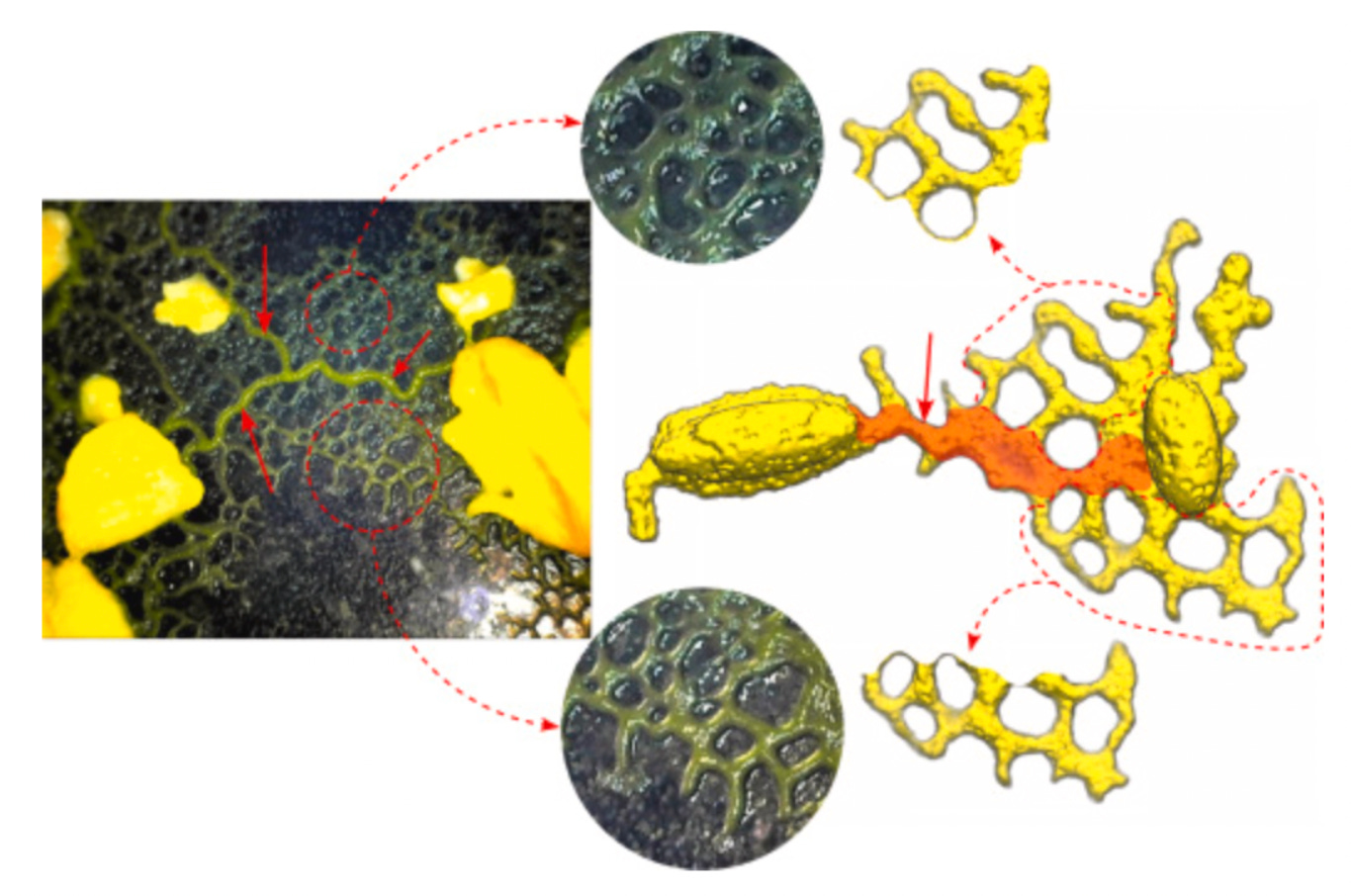 Comparison between simulated slime mold network using model in the paper (right) and observed slime mold network (left). The model is able to accurately capture components of the observed network, for instance, the formation of thicker branches between nutrient sources (highlighted in red on the right).